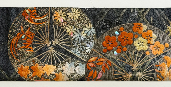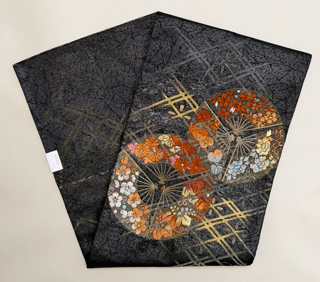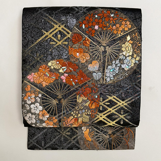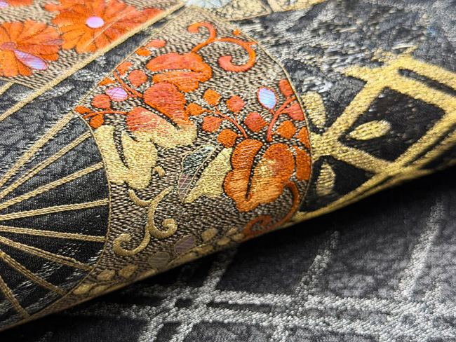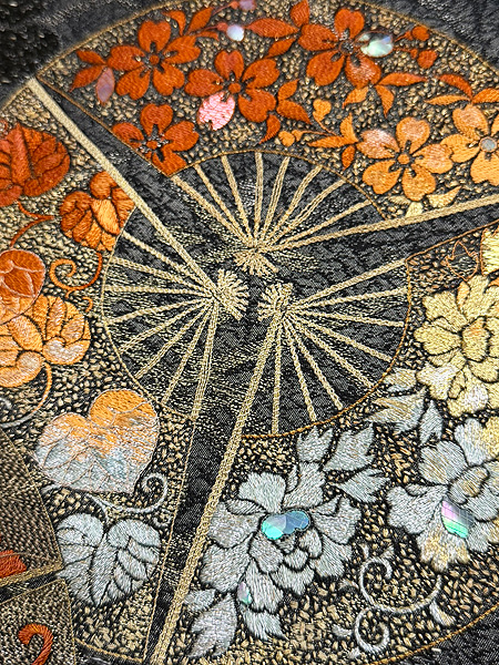 有職菱の地紋が漆糸で織り込まれた豪奢な帯の上に、3つ扇が刺繍されています。