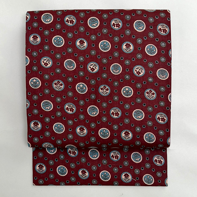 小さな丸の中にいろいろな草花が描かれた可愛らしい文様の帯です。