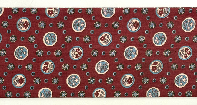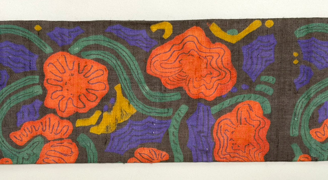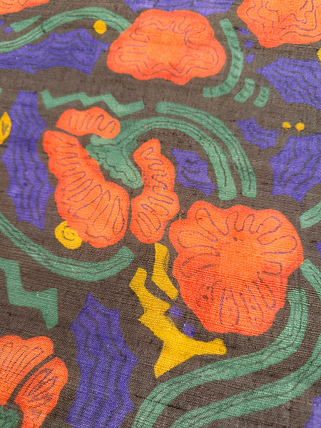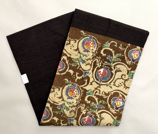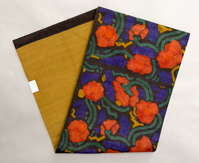 葡萄茶色のぼかしの中に大柄な更紗文様の花々を染めた個性的な帯。