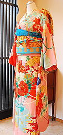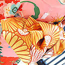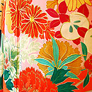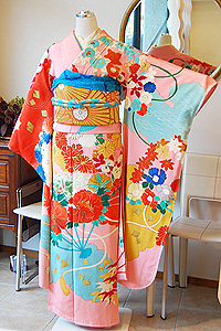 やさしいピンク地に、大輪の牡丹、菊、橘、紅葉の花々が円形に繋がる花丸文が優雅な振袖です。