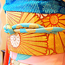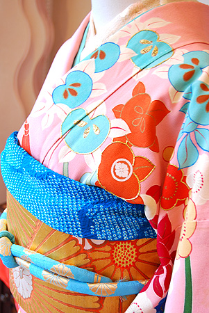 朱赤と金、銀にて織り出された豪華な丸帯を。