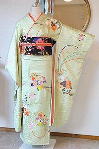 光沢感のある優しい鶸色の地に、ふっくらとした花くす玉が手刺繍により施された愛らしい振袖です。