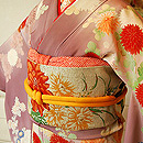 柔らかな縮緬に優しい色合いで菊の花が描かれた一枚。