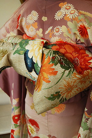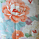裾の大輪の牡丹から肩周りの小菊へ移り変わる様子が、流れるような美しさを生み出しています。