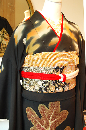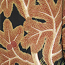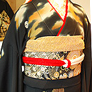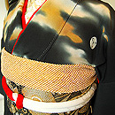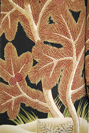 錦紗縮緬地に手描き友禅染により描かれた抽象的な松文様。 ふっくらとした松のフォルムがシックな色使いと相まって、独特な世界観を醸し出しています。 松も非常に繊細に描かれ、所々に松ぼっくりを持たせた味わい深い図案です。