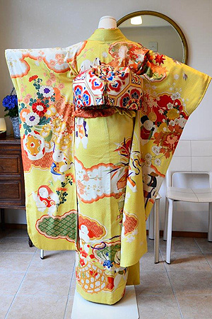 唐子人形花籠文様綸子振袖