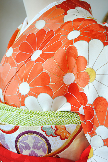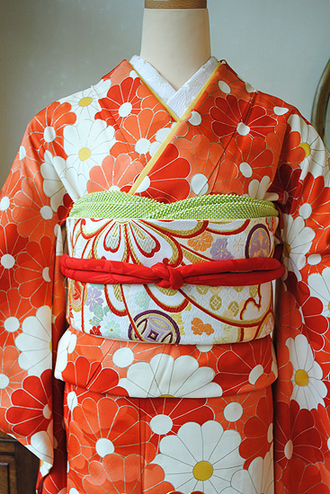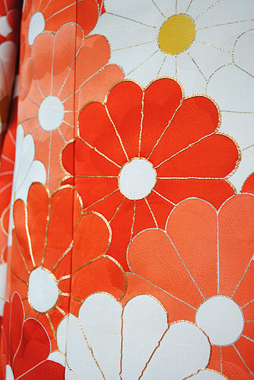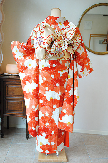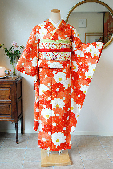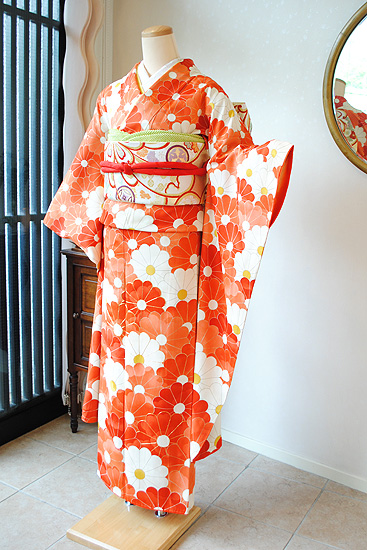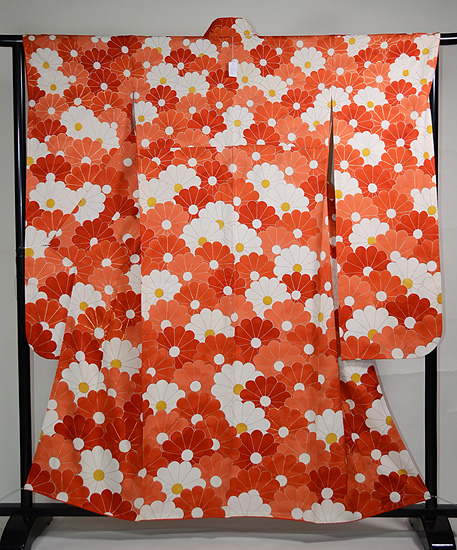 赤と朱色と白、3色の菊花文様だけで構成された珍しい図案で、シンプルながらも印象的な振袖です。