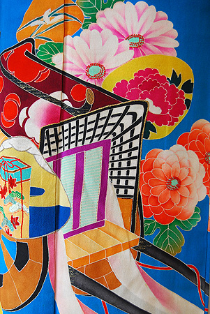 上前には御所車や貝合わせ、御簾が描かれ高貴な図案となっています。