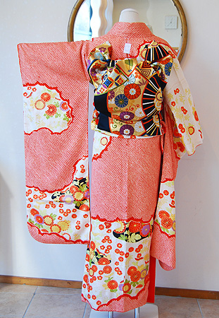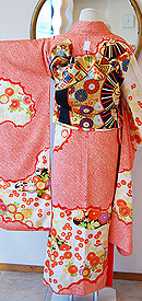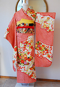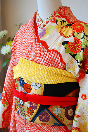 ふっくらとした赤い絞りの地に染め抜きで菊尽くしの文様が染められた可憐な雰囲気の振袖です。