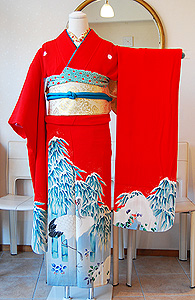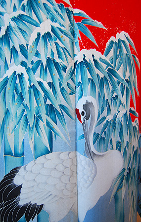 雪持ち笹に丹頂鶴の図朱赤振袖