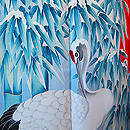 鮮やかな赤とは対照的な墨絵のような色彩で描かれた雪持ち笹の冬世界。吉祥草と赤い実をついばむ丹頂鶴が美しく、まるで日本がを眺めているような図案です。