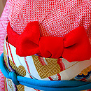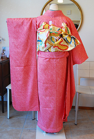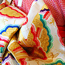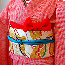こちらでは、雲取り文様の金糸、色糸が華やかな可愛らしい丸帯を合わせ、若々しいコーディネートにしてみました。