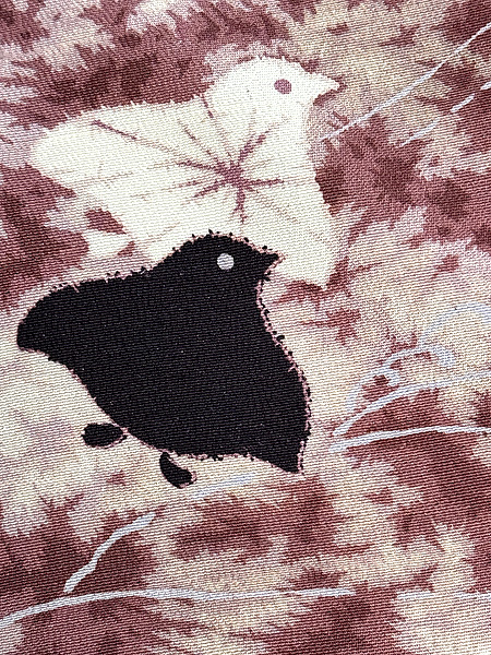 柔らかな一越地に樹木が生い茂り、上を千鳥がスーイスイ。 少し幻想的なムードが漂っています。 絞りのように見えますが、型染めで染められています。