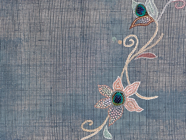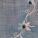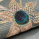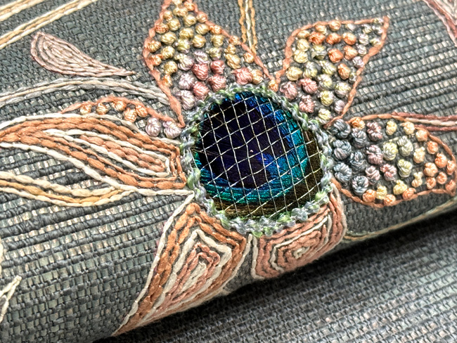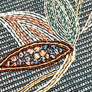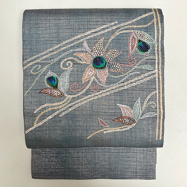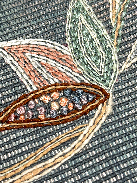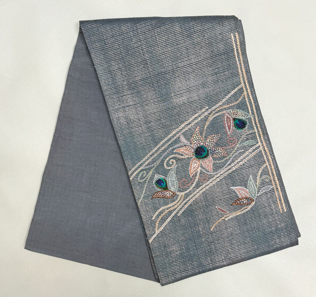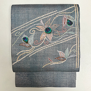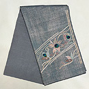 金の上にさび浅葱の漆をかけた糸を緯に使って、深く重みのある表情をした袋帯です。 アールデコ調の刺繍は、相良縫いや菱掛けの技法も愛らしく、おとなかわいいデザインになっていますので、普段使いにも重宝しそうです。