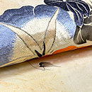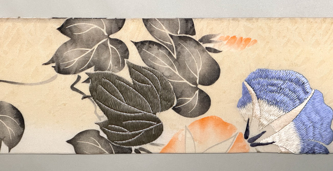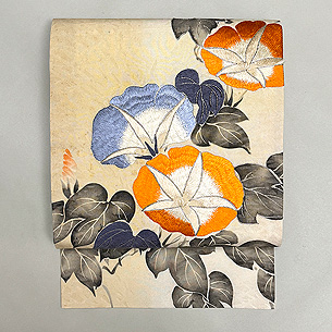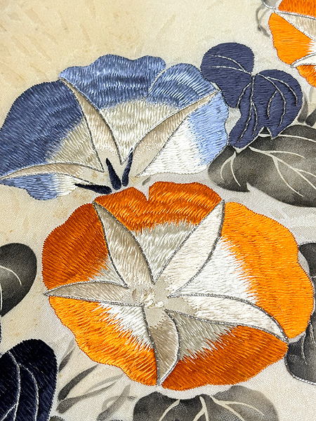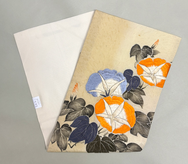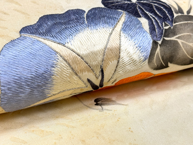 大輪の朝顔が、今朝開いたように新鮮な刺繍で表現されています。 地にも透かし文が入って涼やかさを演出しています。