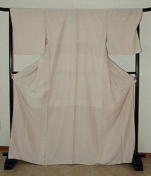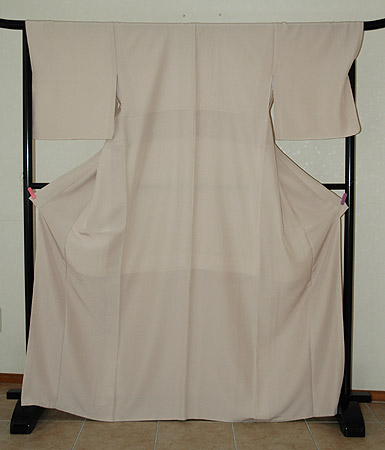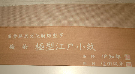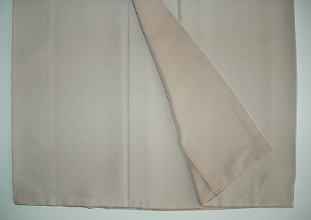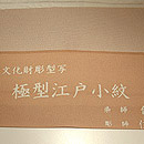 一越縮緬を亜麻色で行儀に染め抜いた江戸小紋です。ごぐ細かな白い粒が斜めに整然と並んだ模様で遠目には白に近い色にみえます。 さまざまな小紋柄がありますが、行儀は小紋三役のひとつで紋をつけて略礼装とすることができます。 今のまま紋をつけずに楽しまれるのももちろんお勧めです。
