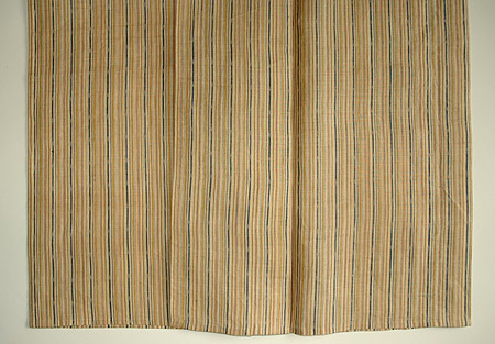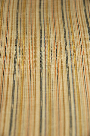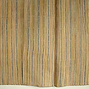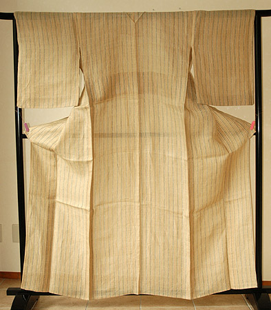 薄茶地に藍、金茶、紅色など数色の縦糸が使われ縞に織られた越後上布です。 民芸的な風情で、糸味が非常に繊細で手績みにより手仕事の素晴らしさに感動せずにはいられません。 是非お手にとって(さらにルーペを使って拡大して!)じっくりとご覧頂きたい一着です。