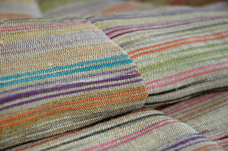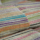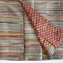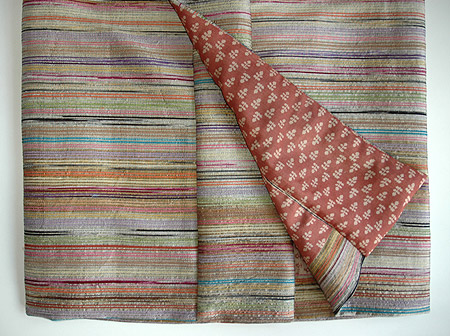 裂織りの布地をコートに仕立てました。 胴裏はインドのサリーを使用しております。 このほかに黒ベースの色をご用意しましたので、店頭にてご覧ください。