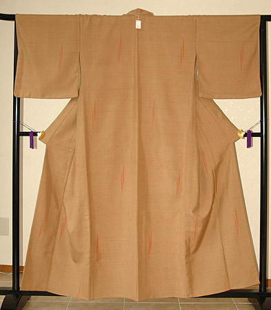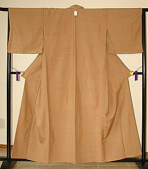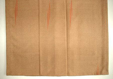この着物をみると、沖縄の赤絵の焼物を思い出します。 かの柳宗悦は雑誌「工芸」で、「沖縄の焼物を見せられたら、色々ある中で誰の眼にも止まるのはおそらく赤絵であろう。」と言っています。 先代の織元は宗悦らと民芸運動を興した1人とのことで、頷けます。 この朱色がとても効いています。