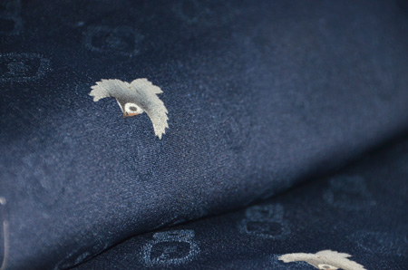 藍色の地に軽やかに飛んでいる雀が描かれた付下です。 お気軽なお出かけにご愛用ください。
