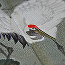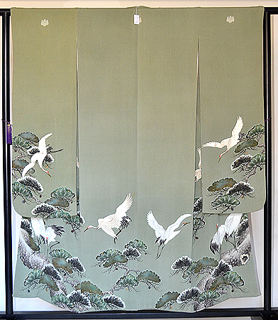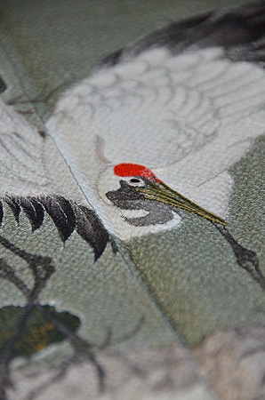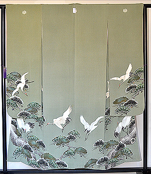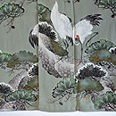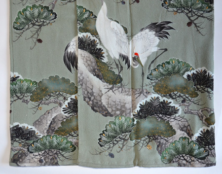 松の緑に白い弦の群れ飛ぶ姿が鮮やかな大振袖で、縮緬地に大きな5つ紋が染め抜かれています。 結婚式のお色直しの着物で、多分白→赤→黒に続く4枚目のお召し物だったように思われます。 昭和の中期にそのような優雅な式がまだ残っていたのでしょうか。 残念ながら袖の地色が変色しています。