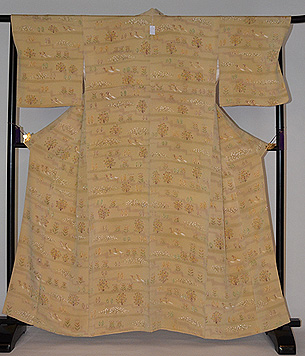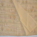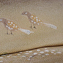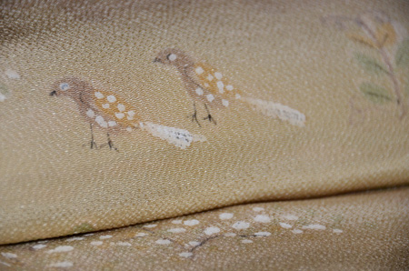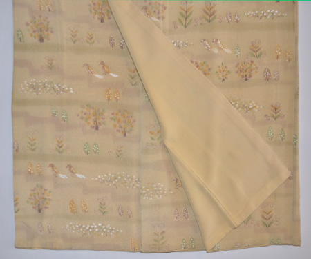 一方づけ染め小紋です。 卵色の地に木々の狭間に鳥が描かれ、パステルカラーの色調が優しいです。