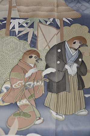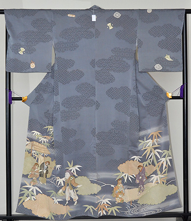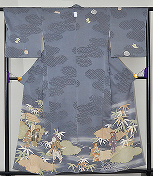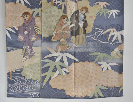 昔話、舌切り雀のお話が描かれた付下です。 裾模様には、雀を追ってきたお爺さんとそのお爺さんを迎える雀の姿。 袖と胸元には、お土産のつづらを連想させる宝尽くしの文様が描かれています。 淡い縹色の綸子地に、青海波文・亀甲花菱文・七宝文の地模様が入ったとても華やかなきものです。 下がり藤の一つ紋が背中心に入っています。