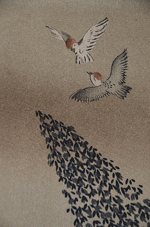 竹林に舞う雀が可愛らしく描かれて、濃淡の付いたぼかしが竹林にかかる靄のようにも見えます。 更に可愛らしく所々に刺繍をいれました。 でしゃばり過ぎない控えめな感じですが、着る人をセンス良く引き立ててくれそうです。