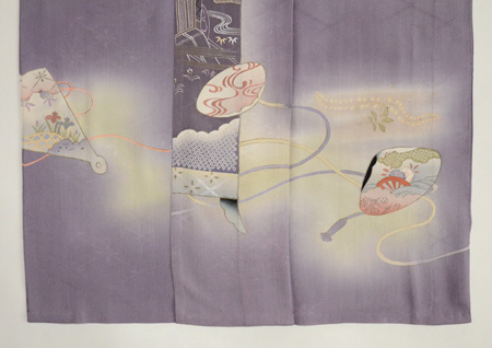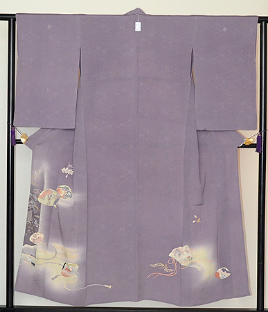 藤色にしては割と色やけが少ない付下です。 かわいい芥子縫いで角に茗荷の3つ紋が入っています。 地紋は業平菱で見合わせの図、地色と主に初夏のお出かけ用に優しい一枚です。