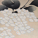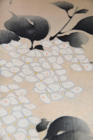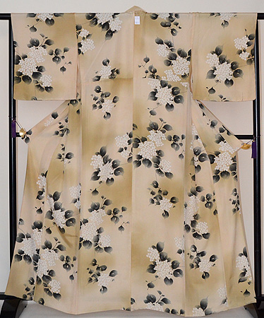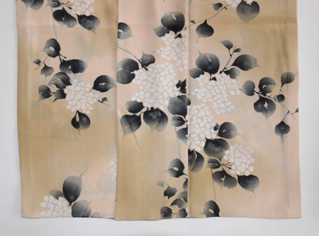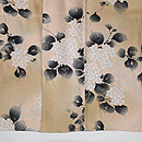優しい亜麻色のぼかしに梅雨の頃静かに楚々とした風情を感じさせる紫陽花の小紋です。 紫陽花の文様ですと、鮮やかな青や紫の花びらを思い浮かべますが色がついていない分じめじめした梅雨というよりも雨があがったばかりの梅雨明けを連想させます。 昭和の中頃の一越縮緬のお着物をお仕立て直ししました。