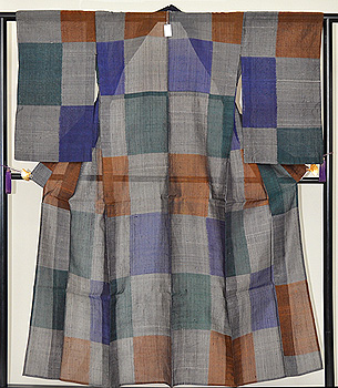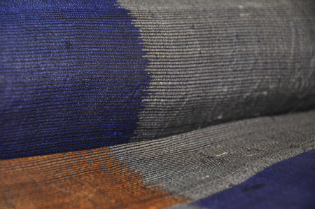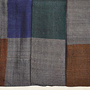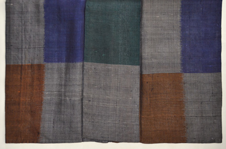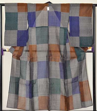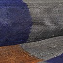 鉄紺、褐色、濡羽色と日本の伝統的な色が使われ、大胆な構図の中にも落ち着いた渋みを出した着物です。 こういうお着物は帯も大胆にコーディネートしてみると楽しいですね。 濡羽色とは土も石も草木も緑も、雨に濡れると見る見るうちに色が暗くなる。そんな色のことだそうです。 日本人の色彩感覚は情緒豊かで本当に素晴らしいです。