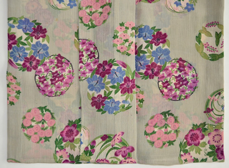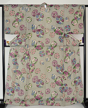 状態が良かったので、お仕立て直しをして大きくなりました。 華やかでかわいい丸柄を地色のグレーが締め、とても着やすい夏のおしゃれ着になっています。