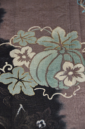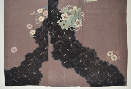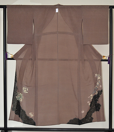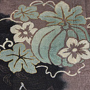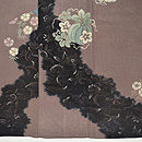 唐草の地紋の絽錦紗に裾の墨と深川鼠が利き色となって、美しい付下に仕上がっています。 桐の3つ紋が銀糸で駒縫いされています。