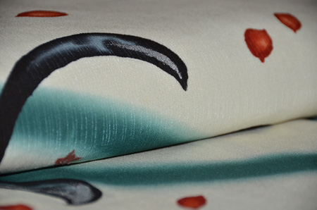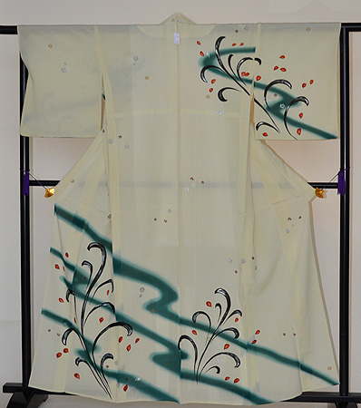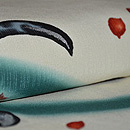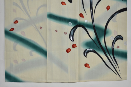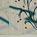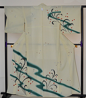 新緑の息吹を感じさせる、生命力のあるのびのびとした構図です。 撫子の花が銀糸や漆糸で施され、このお着物にリズム感を出してくれています。 爽やかな色合いなので、単衣の新緑の季節に良く映えるお着物になると思います。
