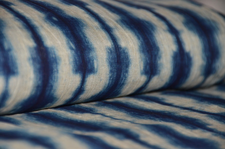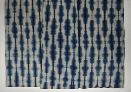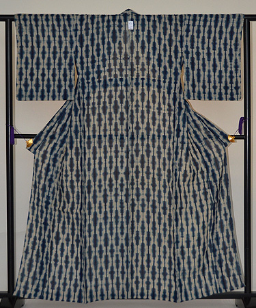 藍染作家 新道弘之の藍絞りの着物です。 新道氏は日本古来の藍染の創作により、作品が世界各国で高い評価を受けています。 奥様は絞りの縫いしめをされ、仕事をする家族が藍の色に深まるように藍で結ばれているのでしょう。 京都にある私設の「小さな藍美術館」には同氏のコレクションも公開されています。 夏らしい藍、絞り柄もすっきりして着こなし易い着物です。