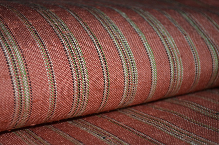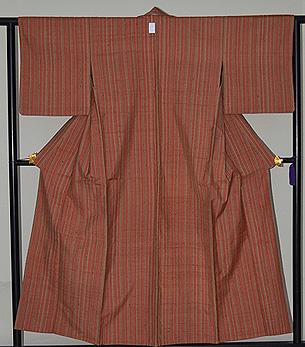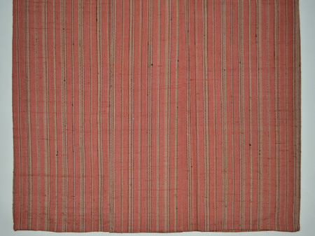 薄柿色に黄緑、乳白色の子持縞がやさしい印象です。 伊兵衛織の中でも格子や個性的な縞柄と比べ、外国裂から和の帯まで楽しめます。