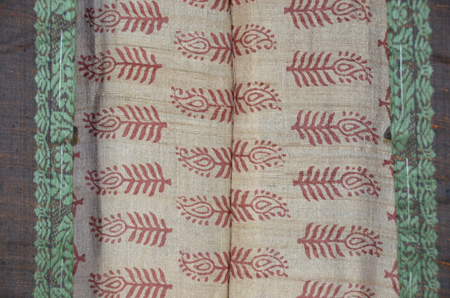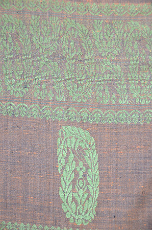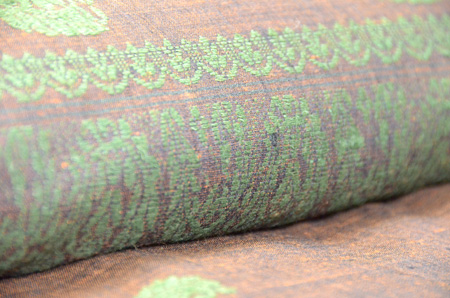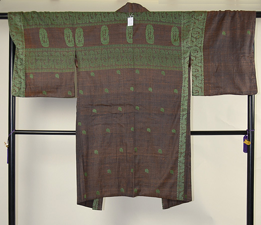黒の経糸と辛子色の緯糸で織りなされた茶色の地に、木綿糸で紋織りが施してあります。 風合いが柔らかく、軽く暖かでしなやかな羽織になりました。 裏地もインドサリーの紬地がついて、満足いただける着心地です。