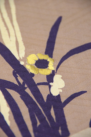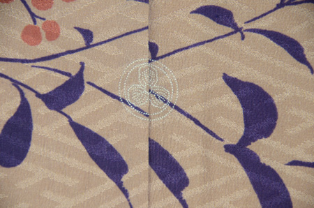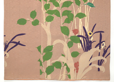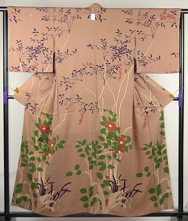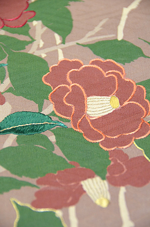 南天と椿の赤茶と、葉っぱの緑が印象的な付下げです。 沢山の実をつける南天は、家庭の繁栄の象徴、常緑の葉を持ち日陰でも花の咲く椿の性質は ヨーロッパでもブームになったそうです。 地紋の紗綾形とケシ抜いの柏の3つ紋が、黄色の水仙と共に可憐さを加えています。