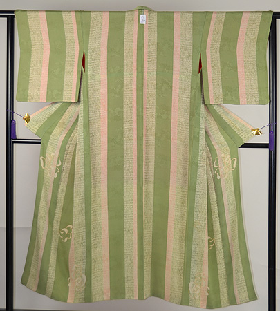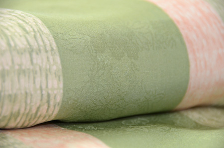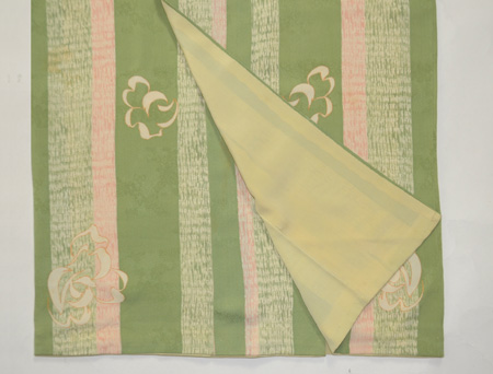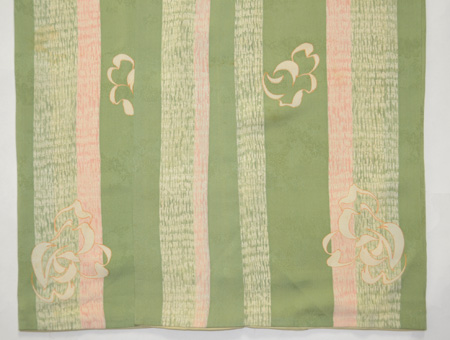この秋から冬にかけては、美しい散歩着が何枚か店頭に並んでいます。 これもその1枚ですが、残念ながら寸法が少し不足です。 大きな縞が絞りのようにぼかされて縦にながれ、バラが3輪咲いています。 あまり主張しないで柔らかな雰囲気そのままに、優しい訪問着となっています。