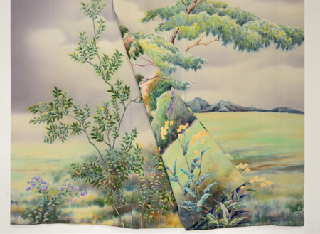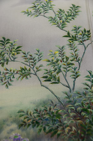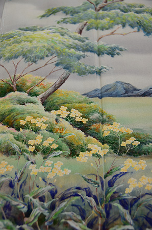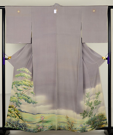 まるで油絵を思わせる情緒豊かな風景文様の色留袖。 銀ねず色の地に鶸色をベースに草原、草花が描かれ、遠く山々が望めます。 野薔薇や野菊などの花々が可憐な印象を与える、とてもお洒落な色留袖です。
