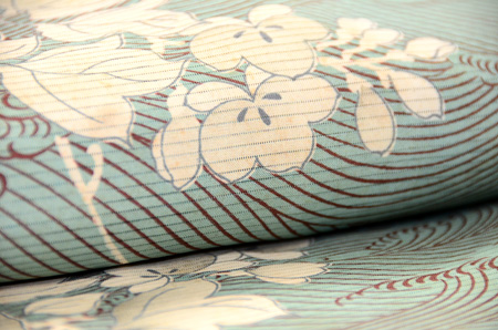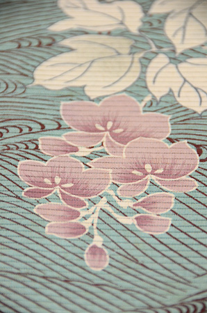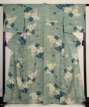 紺碧の海に葛の美しい花がかかっています。 藍色の葉と白抜きの葉、そして薄い桃色の花の絶妙なバランスで、落ち着きと可憐さを同居させています。 かなり大きめに作ることができましたので、身長の高い方にもお選びいただける着物になりました。