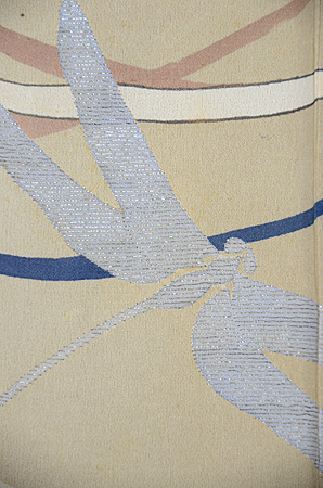 砂色の錦紗地にゆったりと飛ぶ2匹の勝虫。 露芝には、蒔絵のような金、銀糸の刺繍がほどこされています。 目立ちませんが、細かな縫いでぼかしも入った三つ紋のある上品な羽織です。