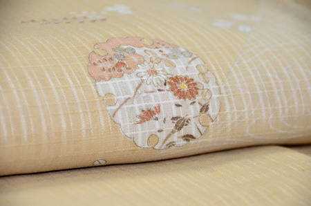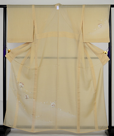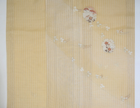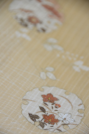 鳥の子色のきれいな地色に、細い線で控えめに描かれた萩と花入り雪輪がとても上品なきもの。 紗織は、経に細く縞が綾織られ、緯は節糸が規則的に入り、格子のように織りだされていて、一般的な付下訪問着よりも、とても洒落た印象です。