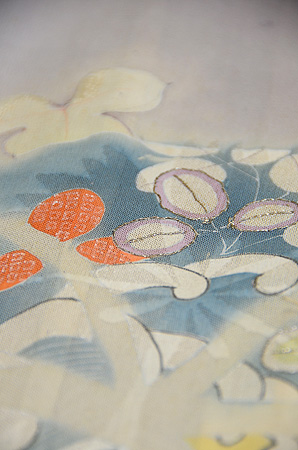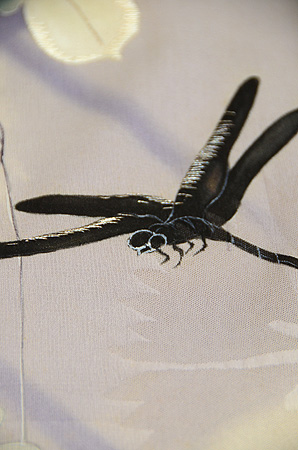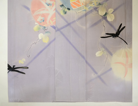 薄い藤色の単衣地には所々撫子の撫子の花が透かしになっており、下に重ねる襦袢が透けて見え、風情ある涼しげな雰囲気。 烏瓜、桔梗、萩の葉に蜻蛉が描かれ、初秋ならではの季節感が溢れます。 蜻蛉の黒の部分が全体を引き締めるアクセントとなり、少しモダンな印象に。 黒い帯を合わせても素敵です。 秋の始まりをこんな単衣で迎えてみたいものです。