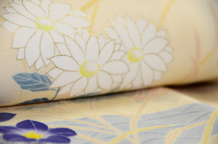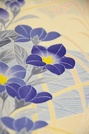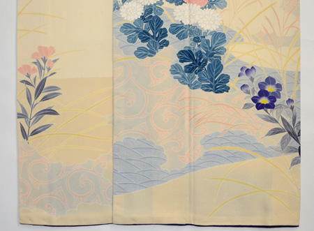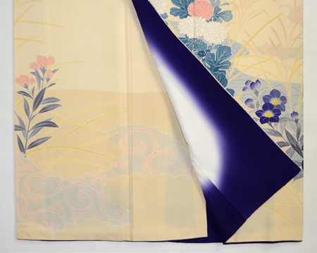 鳥の子色におおらかな雲取り文様、間からは唐草文様と青海波、そして美しく凛と咲く桔梗や小菊の花紫色がやさしい地色に華やかに映える訪問着です。 桃山時代に明から伝えられた紗綾形に蘭と菊をあしらった本紋が地紋に織りこまれ、八掛も正倉院文書にもある青褐(あおかつ)を合わせた凝ったお着物です。