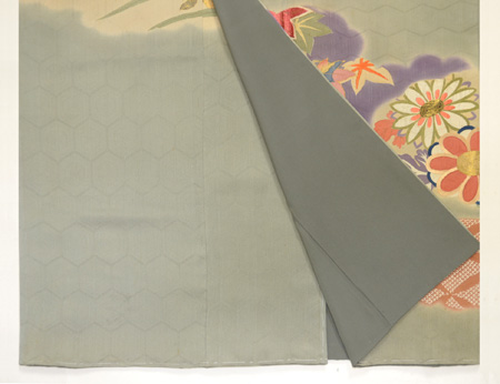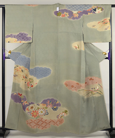 柳鼠の綸子地の訪問着です。 雲取りの中には四季の花花が沢山描かれて、刺繍と疋田模様がアクセントになっています。 昭和初期のお出かけ着です。