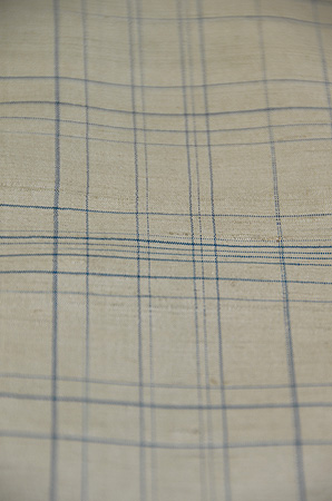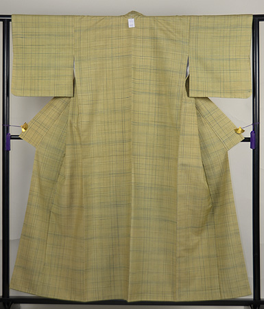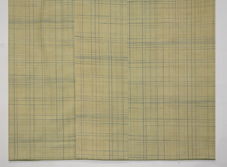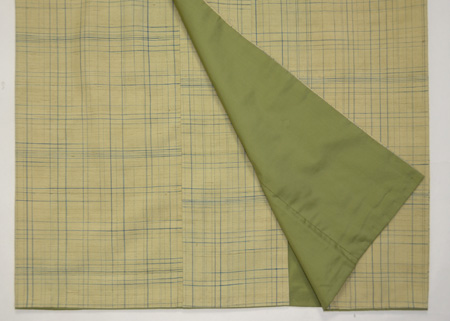 春の蕨色を思わせる爽やかな紬です。 本当の蕨はもっと暗い色なのに、春のせいでしょうか。 蕨色というと、こんな風に明るい色を連想してしまいます。 黄色に藍をかけ、その藍を重ねて濃くし、格子の糸としています。