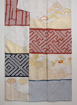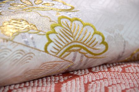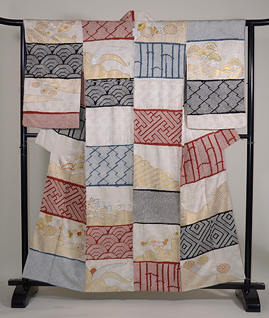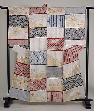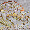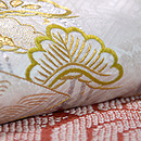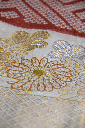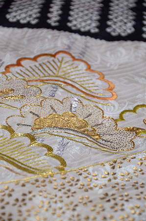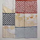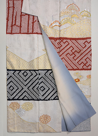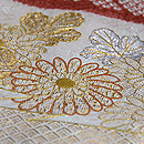 幾何学文を本疋田で、紗綾形の緞子には春蘭と晩菊がおりこまれています。 そして、七宝の箔に梅の刺繍、霞に菊、松菱に老松、雲取に梅など、吉祥文様がしっかりと描かれています。 昭和後期の見事な工芸が光る1品です。