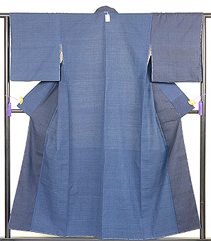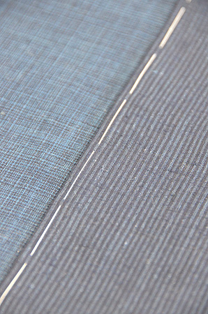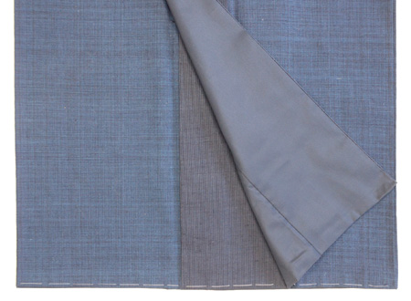 遠目には無地に見える変わり微塵格子を身頃にして、衽、掛け衿、右袖には細い縞結城を切継ぎした藍色の美しさが際立つお着物です。 しゃり感を残し、水をくぐり柔らかくなった結城には、纏うと軽くなんともいえない心地良さがあります。 飽きがこず、年齢を問わずお召しいただけるお薦めの一枚です。