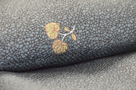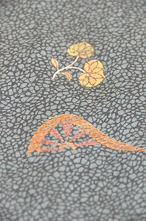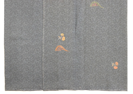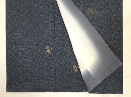 まず葵を糊置きし、藍ガメにいれてから江戸小紋の糊置きをして、再び藍に浸すという技法です。 糊を取った後、葵に顔料で彩色し、漆で描線をしています。 深みのある上品な小紋になっています。
